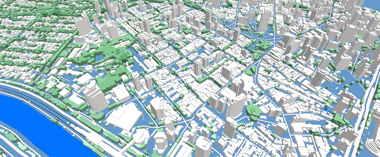 The 3D map is created at 1-meter resolution and includes buildings modeled at LOD 1.3, representing both the general shapes and roof structures. Streets, terrain, and urban layouts are accurately depicted, providing a realistic and comprehensive view of the city.